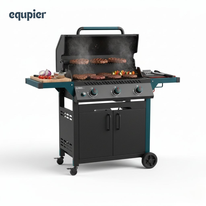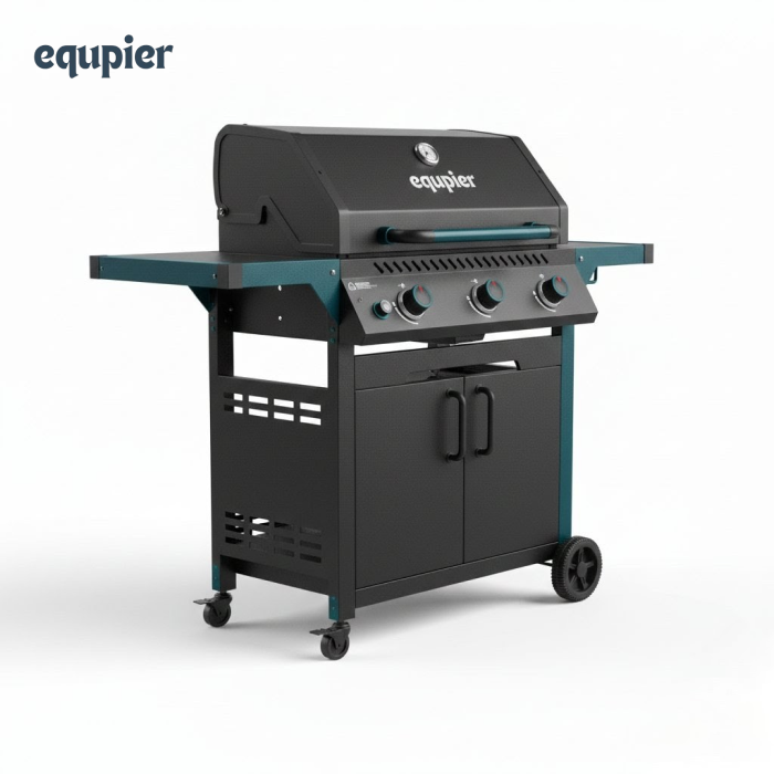 The equpier 3-Burner Gas Grill is a compact yet powerful outdoor cooking solution, featuring a sleek black finish accented by striking Azure Blue elements. Designed for modern living, it offers a robust 30,000 BTU output across three main burners and maximizes small-space utility with convenient foldable side shelves. It provides a total of over 500 square inches of cooking space, making it perfect for family meals and small gatherings on a patio or deck.