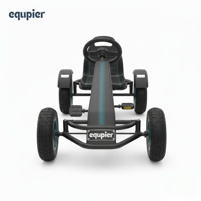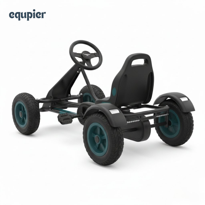 The Equpier Off-Road Youth Pedal Go-Kart is engineered for adventure and outdoor play. It combines a durable, low-maintenance design with a sporty, aggressive look. The primary color is a matte black finish with striking teal accents on the wheel hubs and the central racing stripe. The wheels are large and have a rugged, knobby tread pattern, suggesting capability on various surfaces, from sidewalks to grass and light gravel. Operation is purely pedal-driven, connected to a chain mechanism (likely enclosed for safety). For steering, it features a smooth, direct-link steering wheel. A key safety feature is the prominently placed handbrake lever, which controls the rear wheels. The single, high-backed bucket seat is designed for ergonomic comfort and can be adjusted forward or backward to accommodate different heights.